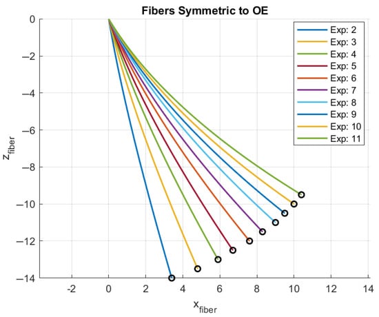 Using the polynomial coefficients from Table 2, it is possible to reconstruct the optical fiber shape approximation in the z-x plane for the many positions measured using the camera and presented in Figure 4. The corresponding plot is presented in Figure 7.