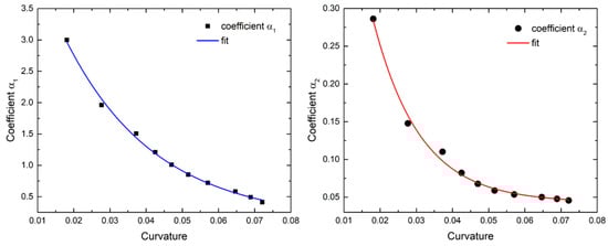 - Application of Equation (18) along with the fit parameters from Table 3 to determine the polynomial coefficients α1 and α2 at curvature κ;