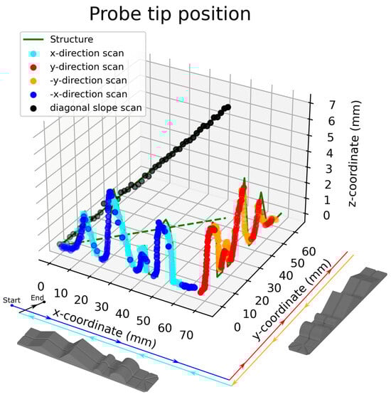 Probe tip coordinate measurement (blue, cyan, orange, red, and black dots) versus real shape coordinates (green line). The dashed green line is the x, y-axis projection of the diagonal scan. The structure orientation is presented below the x- and y-axes along with scan trajectory.
