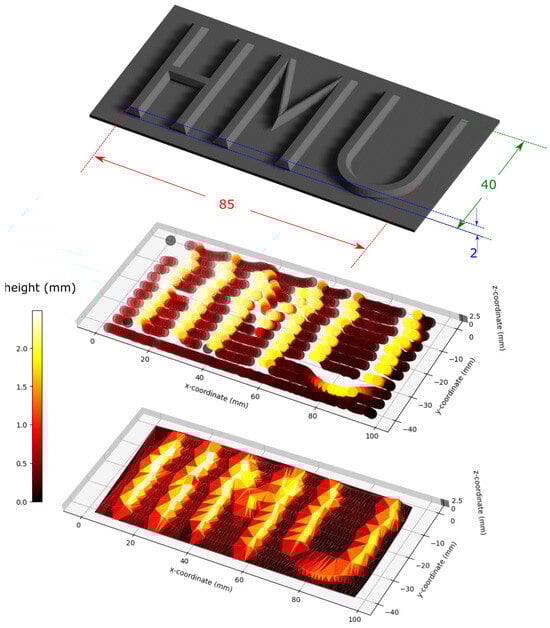 The developed algorithm was then used to line scan a 3D-printed structure with the initials of HMU, i.e., Hellenic Mediterranean University, with a letter height of 2 mm and feature width of 4 mm. A sketch of the structure is presented on the top side of Figure 11.