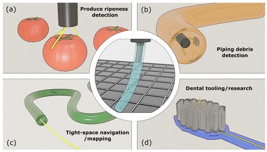Applications of tip-positioning optical fiber sensor (middle): (a) fruit/vegetable ripeness sensor, (b) piping debris/agglomeration detection, (c) tight-space navigation/mapping, and (d) dental tooling/research.