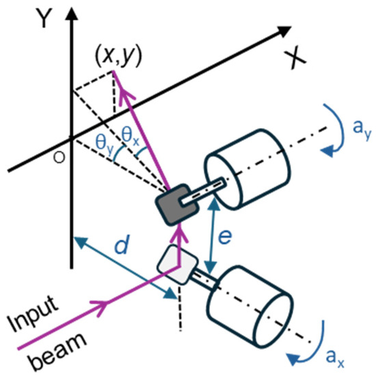 In this study, a large beam diameter dual-axis scanning galvo system (GVS312/M, Thorlabs GmbH, Bergkirchen, Germany) and a GPS011-EC power supply (Thorlabs GmbH, Bergkirchen, Germany) were used. The dual-axis system consists of two mirror and motor assemblies, an X-Y mounting bracket, and two driver cards, which offer the advantage of a simple analog command signal interface. Figure 2 illustrates the system, where and represent the optical scanning angles resulting from the mirror rotation, e is the offset, and d is the distance between the second mirror and the target [22]. Equations (1) and (2) describe the Cartesian coordinates in the plane resulting from the laser deflection by the mirrors [23].