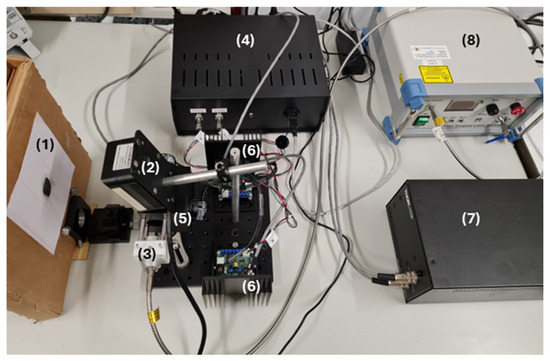 Experimental setup. (1) Target with the sample to be irradiated; (2) Sunell Dual IP Thermal Cube Camera; (3) Collimator (FPYL-COL-A) and 3D-printed component made of PLA filament; (4) Control unit; (5) Dual-axis scanning galvo system (GVS312/M) and (6) driver cards; (7) GPS011-EC power supply; and (8) Fiber-Coupled Laser System (FC-808–2 W).
