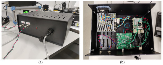 (a) Front view of the control unit, showing the two circular 3-pin connectors that link the DAC’s two output channels to the driver cards of the scanning galvo system, an LED, and the USB port that connects the Raspberry Pi to the laser system. (b) Top view of the control unit, revealing its interior, where are located, from left to right, the RT-50B power supply, the BP-DAC61402EVM, and the Raspberry Pi 5.