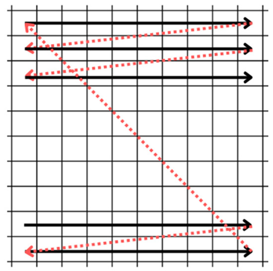 Raster scan pattern. The movement occurs from left to right and from top to bottom. The horizontal and vertical retraces are shown in red.