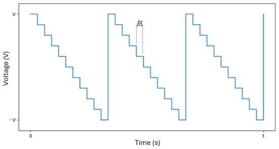 For this work, a raster scan pattern was chosen, as shown in Figure 6. This scanning method was selected due to its simplicity and the uniform exposure it provides across the entire scanning area. While other scanning patterns—such as those based on sinusoidal signals—can offer performance advantages under certain conditions, they are typically more complex to implement and often result in non-uniform coverage. In contrast, the raster scan ensures a consistent and predictable motion, with the beam moving line by line, from left to right and from top to bottom. Whenever the beam reaches the end of a line, it returns to the beginning of the next one (horizontal retrace). Upon reaching the end of the last line, it quickly returns to the upper-left corner to start a new cycle (vertical retrace). Figure 7 illustrates the signal corresponding to this pattern, characterized by small steps due to the process of converting a digital signal into an analog one. Each voltage value moves the beam to the center of a new pixel, and the time between voltage updates, , defines the scanning speed. This approach was chosen because it requires lower temporal precision from the microcontroller and less computational capacity. The signals that control horizontal and vertical scanning are similar in form (approximately a sinusoid), with the horizontal signal having a higher frequency due to the nature of the line-by-line movement of the raster scan. The specific frequencies in each direction depend on the scanning parameters used.