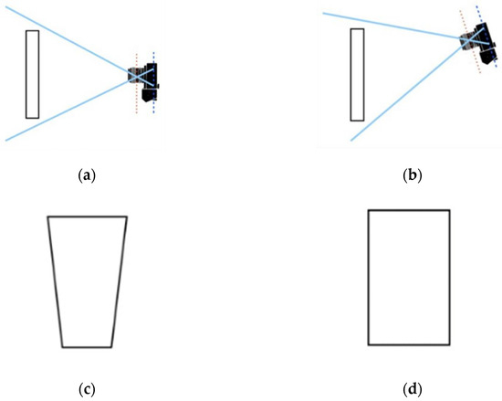 Views with (a) the camera perpendicular to the imaged plane, and (b) the camera tilted relative to the imaged plane. (c) Illustration of the Keystone Effect, and (d) resulting image after correction. Adapted from [28].