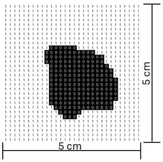 The control software was developed in Python (version 3.13.2) and receives as input a 30-row by 30-column matrix, representing the predefined maximum scanning area. In this matrix, black points indicate the region of interest to be scanned, as illustrated in Figure 5. The matrix size was determined based on the maximum scanning area and the characteristics of the laser used, ensuring the most uniform exposure possible throughout the scanning process.