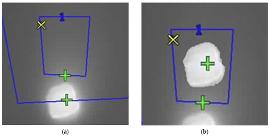 Thermal images (a) with the parallax effect and (b) with its correction. Blue Boxes represent the regions of interest (central, with a blue “1”, and background), and the colored marks indicate the pixels with the highest (green) and lowest (yellow) temperatures, for each region (yellow marks are superposed in the images).