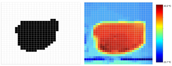 The conversion of thermal image intensity values into temperature data is carried out through a normalization and scaling process, ensuring accuracy in the interpretation of the recorded thermal variations. The camara produces a thermal image of 256 × 292 pixels with a temperature accuracy of ±2 °C and an operational range of −20 °C to 150 °C. The colormap of the image was set to be grayscale, with the intensity in each pixel proportional to its temperature. The camera also provides, for each image, the maximum (lighter pixel) and minimum (darker pixel) temperature measured. With this information it is possible to build an image, where each pixel is the value of the temperature, using Equation (6). Thus, each pixel is translated into its corresponding real temperature, resulting in a high-precision thermal matrix that preserves the original resolution of the image (Figure 15).