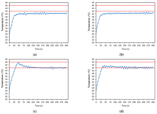 The parameters , , and were then tuned to ensure appropriate temperature control. Figure 17 illustrates part of the PID tuning process, presenting an example of its main steps. Initially, only a proportional gain, , was applied and gradually increased until the system response approached the reference value and began to oscillate (Figure 17a). Next, a derivative gain, , was introduced to reduce oscillations, as shown in Figure 17b. The resulting signal appeared stable but presented a steady-state error, which could be eliminated by adding an integral gain. In Figure 17c, a relatively high integral gain, , was applied, which led to an overshoot, although within the previously defined temperature limits, it was considered suboptimal. To mitigate this, the integral gain was reduced (Figure 17d).
