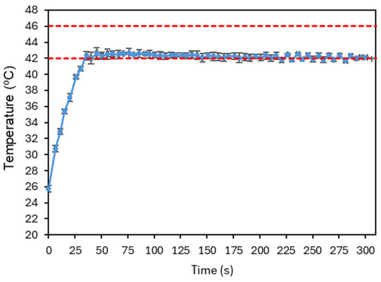 Plot illustrating a repeatability test under the conditions established after PID parameter optimization. Four experiments were considered, and the average temperature of the image at each time point, for each test, was averaged and the corresponding standard deviation is shown. The red dashed lines represent the reference temperature and the limit temperature defined to avoid thermal damage to the irradiated cells.