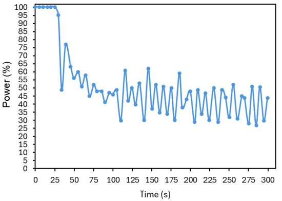 First, it is desirable that the initial slope of the temperature rise be as steep as possible, as the goal is to reach the target temperature rapidly. As shown in Figure 20, which displays the laser power (in percentage) over time corresponding to the data shown in Figure 18, the system was already operating at its maximum power during this period. In this case, this slope could only be further increased by using a laser capable of delivering higher values of power.