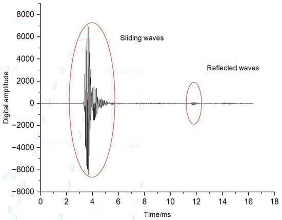 This issue is especially critical in remote-detection acoustic logging tools, which consist of four subsystems: a master control subsystem, a receiver array, an acoustic isolator, and a multipole transmitter, as shown in the upper part of Figure 1. The transmitter node includes monopole and dipole sources. The receiver array consists of 10 stations with a total of 80 receiving channels. Each station has eight receiving transducers arranged in a circular pattern at intervals of 45°. Every two stations share one receiver node, which uses an FPGA as its acquisition controller. The master control node uses a cooperative DSP and FPGA configuration to manage five receiver nodes and the transmitter node via a high-speed synchronous bus, as shown in the lower part of Figure 1 [18,19]. The tool operates in a “monopole + dipole” mode and uses 16-bit AD converters for sampling. In monopole mode, the transmitter node emits monopole longitudinal waves into the formation, and each receiving channel acquires a full waveform comprising 2048 data points with a sampling interval of 8 μs. In dipole mode, the transmitter node emits dipole waves into the formation, and all 80 channels acquire and synthesize into 40 dipole full waveforms with the same sampling depth and interval. Therefore, during each work cycle, 120 full waveforms are generated, with a total data volume of 480 kB. These full waveforms also display clear nonstationary and abrupt characteristics. Figure 2 shows a typical monopole full waveform, with the main frequency of the useful signal ranging from 1 to 20 kHz. The initial part of the waveform contains the sliding waves used to extract the longitudinal and transverse wave information of the formation, while the latter part contains the reflected waves near the wellbore, which are used to determine the reflector positions [6]. Therefore, the development of downhole data compression methods that can achieve a high compression ratio with low distortion, reduce the workload of the master-controlled DSP and not affect the current functions of the tool is crucial.