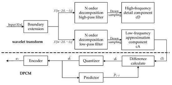 In two-stage data compression, the distortion of the first-stage compression based on the wavelet transform is primarily because of the high-frequency components of the signal. The distortion of the second-stage compression based on the ADPCM is only related to the quantization error . Equation (7) illustrates the relationship between the reconstructed and original values .