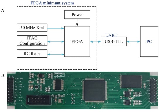 Figure 4A shows a schematic of the FPGA-based two-stage data compression system. The system comprises an FPGA minimum system and host PC, which are connected through a universal asynchronous receiver–transmitter (UART) serial module. The FPGA minimum system, which is responsible for executing the downhole two-stage compression algorithm, includes the FPGA, power, external crystal, reset and JTAG configuration module [23,24,25]. EP3C25E144I7, which is used in the downhole tool, was chosen as the FPGA. The UART module uses a USB-TTL module to realize bi-directional transmission between the FPGA and the host PC. An actual picture of this hardware system is shown in Figure 4B.
