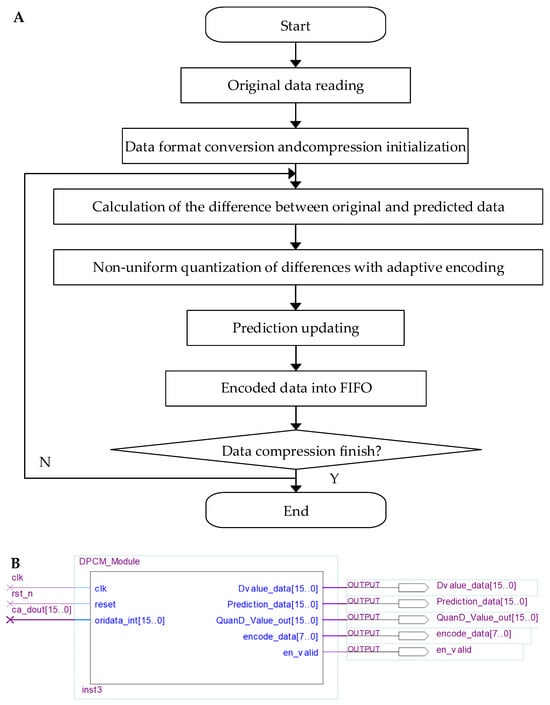 (A) Flow diagram and module of the ADPCM compression. (B) Schematic of the ADPCM_module.