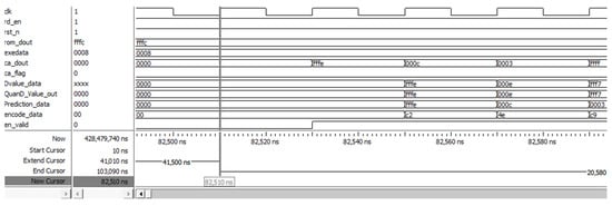 To verify the effectiveness of the two-stage compression, this study simulates the FPGA software (FPGA software ModelSim-Altera 10.4b) using the Modelsim tool. Figure 7 shows the simulation results of the two-stage compression algorithm. The timing waveforms at a specific moment can be observed by pulling the progress bar. Traversing the entire simulation time shows that at time 10 ns (Start Cursor), the system starts to read the original data (rom_dout) from the ROM at a 50 MHz clock signal (clk), guided by the read enable signal (rd_en) and the reset signal (rst_n). At 41,010 ns (at Extend Cursor), once the data reading is completed, the system starts calculating and generating extended data (exedata). At 82,510 ns (at Now Cursor), all the extended data are outputted and the system starts filtering and downsampling under the clock, sequentially outputting the wavelet low-frequency component (ca_dout) data. After one clock of ca_dout starts outputting, the DPCM module starts calculating and generating the difference value (Dvalue_data), quantization value (QuanD_Value_out), prediction value (Predction_data) and encoding value (encode_data) in sequence (Figure 7). Once the wavelet decomposition is complete, the ca_flag for the low frequency of the wavelet components goes high. The data output valid flag (en_valid) turns low when the system runs to 103,090 ns (End Cursor), indicating the completion of the two-stage compression algorithm. The simulation results are as expected and thus confirm the accuracy of the two-stage compression firmware.