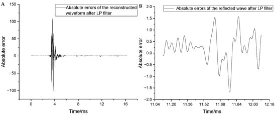 (A) Absolute errors of the reconstructed waveforms after low-pass filtering. (B) Absolute errors after low-pass filtering near the arrival of the reflected wave.