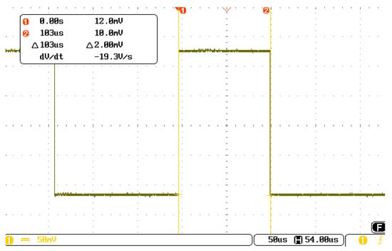 - Execution timeThe execution time of the two-stage compression algorithm under the above conditions was evaluated using an oscilloscope. The results are shown in Figure 13. The time taken to run the algorithm in the FPGA was approximately 103 µs, which is the same as the simulation results.