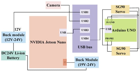 The traveling aid for blind and visually impaired (BVI) people studied in this paper is mainly composed of NVIDIA Jetson nano, D435i depth camera, Arduino microcontroller, 2 SG90 servos, and a 24V lithium battery, and its hardware control system integration is shown in Figure 1.