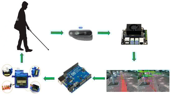 For example, Petsiuk et al. [4] proposed a low-cost, open-source ultrasound-based wearable bracelet type that conveys point-distance information by means of active detection, provides haptic feedback, and generates vibrations at different frequencies depending on the target range, but its narrow scanning angle and limited response speed make it easy to overlook the dangers posed by small, fast-moving objects. Our solution uses an RGB-D camera with a 90-degree horizontal field of view, which reduces blind spot coverage and, through a self-built dataset and detection algorithms, is able to identify common obstacles encountered by visually impaired individuals during travel, while also improving response speed. Papagianopoulos et al. [5] proposed a way to fix an infrared sensor on the top of a blind person’s arm to detect the internal environment of a building through the principle of infrared thermal imaging to guide the blind person to move, but it can only detect important obstacles in the blind person’s path, which has certain limitations. In contrast, our segmentation detection network can simultaneously segment drivable areas of regular roads, blind lanes, and crosswalks, and it can detect 12 types of obstacles in complex outdoor scenes, thus enhancing environmental perception capabilities.
