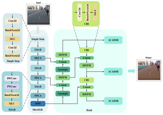 The network takes a 3-channel color image as the input and firstly passes through two convolutional layers with a step length of 2 and a kernel size of 3, combined with the activation function (SiLU) and normalization (BatchNorm, BN), and it performs preliminary feature extraction on the input image. This stage not only effectively extracts the basic features of the image, but it also lays the foundation for normalized and nonlinear expression for subsequent feature extraction. Subsequently, the network further improved the expression ability of features through the Efficient Depthwise Activation Block (EDAB) and the Multi-Scale Context Attention Unit (MSCA) stacked three times in a row. Among these, EDAB reduces the computational cost through deep separable convolution while preserving details; MSCA captures spatial and contextual information through multi-scale convolution and attention mechanisms, optimizes the selectivity of channels and spatial features, and significantly reduces redundant calculations. Finally, the features are fused at multiple scales through the SPPF module, which further enhances the unity of global semantics and detailed features.