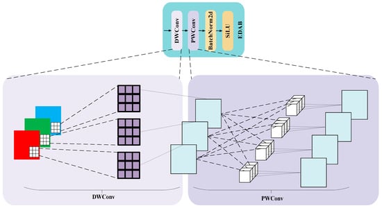 Multi-scale feature extraction is the key to achieving efficient feature characterization for deep learning models in target detection and segmentation tasks. In this study, a novel network structure combining EDAB and MSCA is designed in the backbone part. Assuming an input image , each channel of the input is firstly subjected to an independent convolution operation by a 3 × 3 convolution kernel, followed by fusion of the inter-channel information using a 1 × 1 convolution kernel, and the number of output channels is Cout. Then, the feature distribution is adjusted using the BN, and finally, an SiLU activation function is applied to further extract the more complex features. The structure is shown in Figure 4.