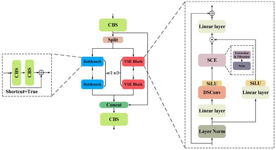 Finally, the first and second branch outputs are merged and mixed by element-by-element multiplication, and the outputs of the VSE Block are generated by residual concatenation. The output features of trunk path and context path are merged again with the features processed by CBS through Concat operation and are further optimized by CBS to generate the final output features.