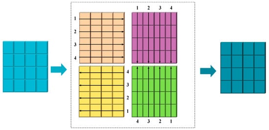 The context path is further divided into the following steps: The input features are normalized by layers and then divided into two branches; in the first branch, the input passes through the linear layer and the SiLU activation function in turn. In the second branch, the input first passes through the linear layer, depth separable convolution, and SiLU activation function in turn, and then, it feeds into the SCE module (which contains three parts: scanning, extraction, and filtering), which takes four different directions of scanning to unfold into a 1D sequence. The image scanning process is shown in Figure 7.