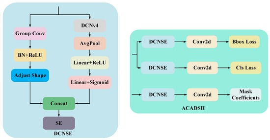 Finally, the network completes the output of the final target detection frame and segmentation mask by combining grouped convolution, deformable convolutional network v4 (DCNv4), and adaptive context-aware detection and segmentation header (ACADSH) with channel attention mechanism. Grouped convolution reduces computational overhead, deformable convolution enhances the ability to model irregular target shapes, and the channel attention mechanism further optimizes feature selectivity and weight assignment. This design allows the network to maintain excellent lightweight performance while maintaining high performance, making it ideal for applications in resource-limited devices and complex scenarios.