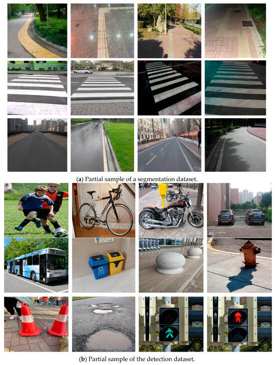 The road area where blind people walk is extended to three categories of blind roads, pedestrian crossings, and ordinary roads as the dataset needed for segmentation, a sample of which is shown in Figure 9a. The blind road data originate from the open-source TP-Dataset [16], containing 1391 images of various typical scenes, including campuses, streets, railway stations, bus stations, underground areas, communities, and hospitals. Pedestrian crossing data, comprising 1100 images, were sourced from the Kaggle platform. Ordinary road data were taken from the All-Weather Road Image Segmentation dataset (UAS) [17], which includes four types of weather conditions, including dusk, night, rain, and bright sunshine, totaling 6380 images. The obstacle detection dataset, on the other hand, is taken from the dataset website (Roboflow), covering 12 categories such as pedestrians, bicycles, motorbikes, cars, buses, bins, stone piers, fire hydrants, conical barrels, puddles, green lights at pedestrian intersections, and red lights at pedestrian intersections, totaling 12,300 images, and a sample of the dataset is shown in Figure 9b.