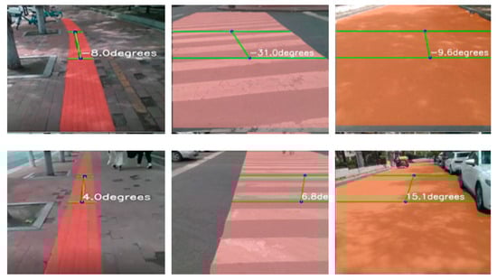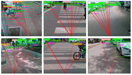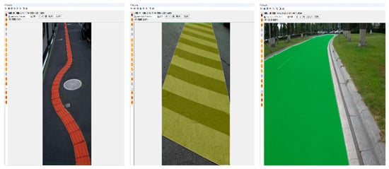 Due to the limited sample size in the segmented dataset, which can lead to poor model generalization, we collected road videos around the school campus. Images were extracted from these videos via frame extraction and combined with data sourced from major dataset repositories and web crawling. This merged dataset was then significantly expanded using data augmentation techniques, including rotation, scaling, translation, color transformation, and contrast adjustment. The total number of images reached 6660 (including 2250 images of blind roads, 2310 images of crosswalks, and 2100 images of ordinary roads), and finally the images were manually labeled using the semi-automatic labeling software X-Anylabeling (https://github.com/CVHub520/X-AnyLabeling/tree/main accessed on 5 July 2025), and the labeled dataset is shown in Figure 10.
