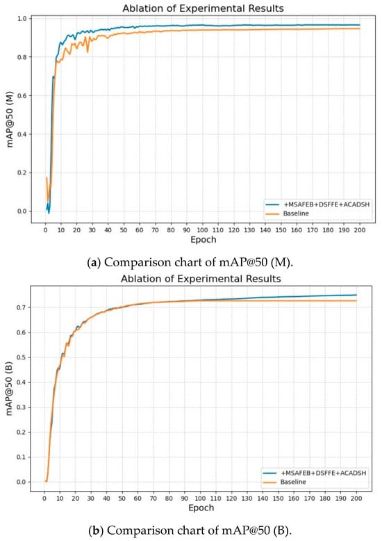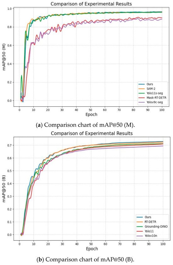 Comparison of experimental results: (a) Comparison chart of mAP@50 (M); (b) Comparison chart of mAP@50 (B).