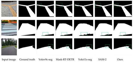 To further validate the superiority of the proposed algorithm and demonstrate that its improvements genuinely enhance model performance, we conducted comparative experiments under identical datasets and experimental conditions. The four typical example segmentation networks, yolov9c-seg, yolo11s-seg, SAM-2, and Mask-RT-DETR, were used to compare the road segmentation task network, and the comparison of evaluation indexes of the experimental results is shown in Table 5. Meanwhile, the four latest target detection networks, yolov10n, yolo11, Grounding DINO, and RT-DETR, were used to compare the obstacle detection network, and the evaluation index comparison of the experimental results is shown in Table 6.