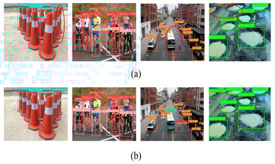 As seen in Table 4, the detection accuracy (mAP) was improved by 1.5, 1.9, and 0.2 percentage points in the obstacle detection task using MSAFEB, DSFFM, and ACADSH, respectively. Compared with the baseline network, the improved network model had an overall improvement of 3.1 percentage points, and a comparison of the results before and after the improvement is shown in Figure 11b. In addition, as can be seen from the table, the improved module combination reduced the model size by 6.6%, the number of parameters by 7.1%, and the GFLOP by 7.3%. Meanwhile, the frame rate was kept above 90 frames/s. The improved model not only significantly reduced the computational complexity, but it also considered the efficient inference speed, which fully met the real-time and resource-friendly requirements of the detection model in practical applications.