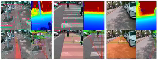 Finally, we deployed the trained model on an NVIDIA Jetson Nano edge device, captured color and depth images simultaneously with the D435i depth camera, and performed road segmentation (identifying walkable areas, calculating road center offsets) and obstacle detection (identifying obstacles and obtaining information about their distance and angle) in parallel. In the multi-scenario field test (Figure 17), the system showed a good segmentation effect under various road types, and it could effectively detect all kinds of static or dynamic obstacles encountered by blind people, even in a partially occluded state. Figure 17 shows the typical test results, the original image on the top left, the depth image on the top right, the road segmentation post-processing effect on the bottom left, and the obstacle detection post-processing effect on the bottom right.
