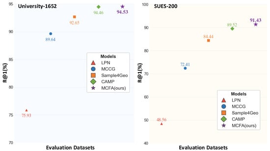As presented in Table 1, the proposed MCFA method achieved 94.53% R@1 and 95.40% AP on the Drone→Satellite task. For the Satellite→Drone task, the model achieved 96.43% R@1 and 93.95% AP. Importantly, our approach surpasses existing SOTA techniques. Compared with CAMP, MCFA improves R@1 by 0.07% and AP by 0.02% on the Drone→Satellite task and improves R@1 by 0.28% and AP by 1.23% on the Satellite→Drone task.