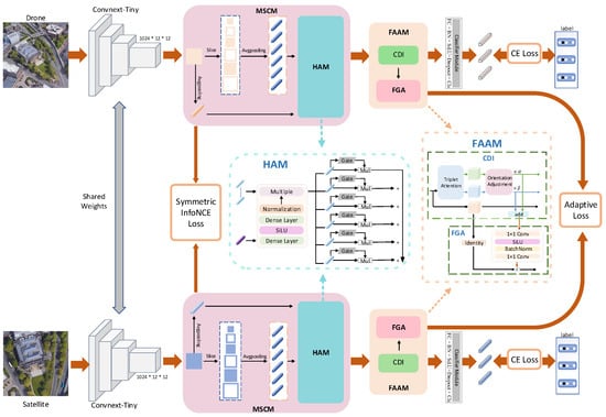 The proposed architecture comprises two parallel branches corresponding to the drone and satellite views. As illustrated in Figure 2, the framework is structured into three functional components. The first is the feature extraction module, which utilizes a pair of backbone networks with shared weights to generate feature representations from both views. The second component, the MSCM, is responsible for aggregating spatial features across multiple scales. The third component, the FAAM, refines the extracted features and aligns them to enhance cross-view correspondence.