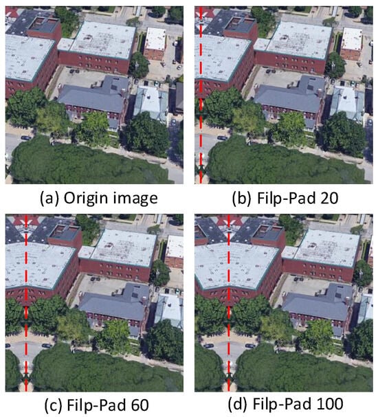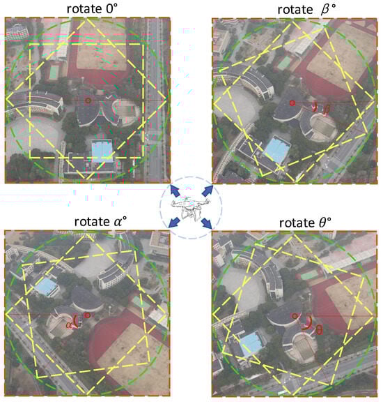 Cross-Dimensional Interaction Mechanism. Several studies [4,41,42,43] demonstrate that incorporating attention mechanisms in both the channel and spatial dimensions can effectively enhance the model’s ability to capture critical features. Inspired by [4], we retain the first two branches of the triplet attention module. Within each branch, feature maps are transformed across spatial and channel dimensions to produce both corresponding feature maps and separate feature vectors. While both branches aim to enhance feature representation, they focus on different orientations: the first branch emphasizes the interaction between height and channels, while the second branch highlights the relationship between width and channels. However, existing methods typically assign fixed weights to these two branches, failing to account for the diverse directional arrangements that targets may exhibit under varying viewpoints or imaging conditions. Since the primary orientation of targets can be distributed at arbitrary angles (as illustrated in Figure 5), a fixed-weight strategy may limit the model’s adaptability when encountering targets with different orientations. To address this limitation, we introduce a dynamic weighting mechanism that adaptively fine-tunes the branch weights guided by the distribution of features. When the principal orientation of the target changes, this mechanism optimizes the weight allocation between the two branches, allowing the model to effectively capture critical features and adapt to targets arranged in different orientations. In this way, the dynamic weighting mechanism enhances the model’s feature representation capability, improving both the accuracy and robustness of cross-view matching. The entire procedure can be formulated as