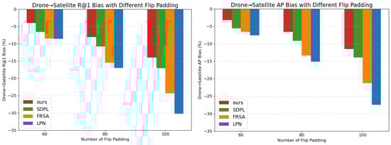 The AdamW optimizer [47] was used during training with a batch size of 32, consisting of 16 drone and 16 satellite images. The initial learning rate was set to , with a warm-up period covering the first 10% of total training steps. The loss weighting factors and were assigned values of 0.1 and 0.4, respectively. All experiments were conducted on two NVIDIA RTX 3090 GPUs under PyTorch 2.5.0 on Ubuntu 22.04.