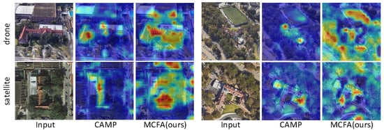 Figure 9 displays the heatmaps obtained from our model and the comparison model CAMP from both drone and satellite perspectives. Compared to CAMP, our model accurately captures the key regions of the target as well as the surrounding meaningful contextual areas. This further demonstrates that during feature extraction, our approach enhances the model’s sensitivity to target-specific information, significantly improving the precision and robustness of cross-view geo-localization.