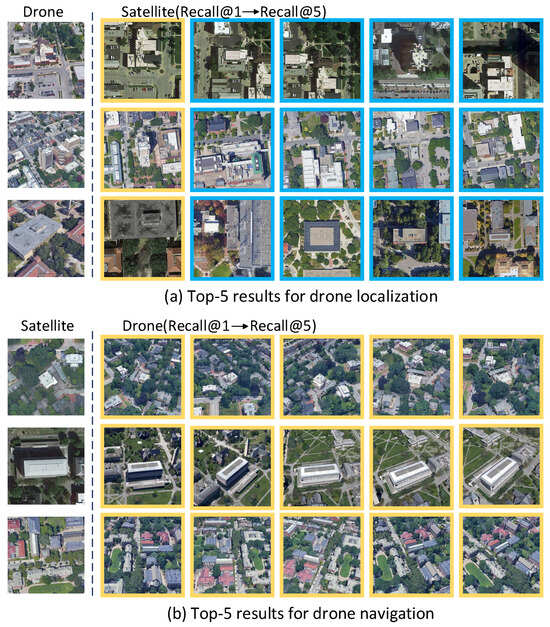 Top-5 retrieval results for (a) drone localization and (b) drone navigation. The yellow box indicates a correct match, while the blue box indicates an incorrect match.