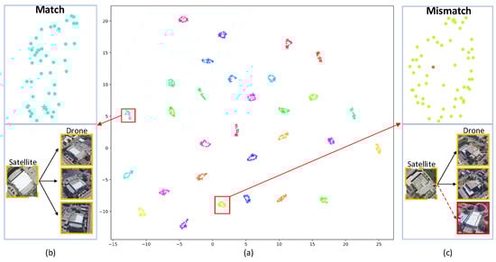 Figure 11a presents the t-SNE [50] visualization results of our model. As shown in Figure 11b, the features are well clustered, indicating successful matching. In contrast, Figure 11c illustrates a failure case, where the drone image is mismatched due to the high visual similarity between two different scenes. The model struggles to distinguish subtle differences, resulting in incorrect associations.