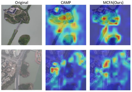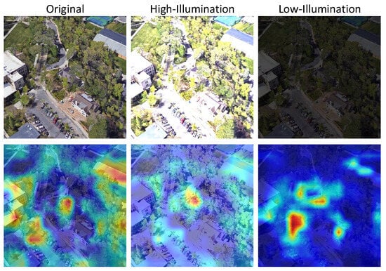 To further analyze the robustness of our model under varying illumination conditions, we visualize the attention heatmaps generated from three types of input: original images, processed high-illumination images, and processed low-illumination images. As shown in Figure 12, the model performs well under normal lighting, accurately focusing on discriminative regions such as roads and rooftops. However, under strong illumination, overexposure leads to the disappearance of key structures—roads become barely visible, and rooftops are difficult to distinguish from the surrounding environment. In low-light scenarios, buildings tend to merge with the background, resulting in suppressed attention responses and reduced feature separability. These observations suggest that extreme lighting conditions significantly degrade the model’s ability to extract informative spatial features.