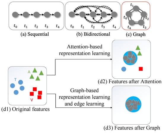 Differences in temporal connection type between existing methods and our method, a different state of features: (a) sequential connection; (b) bidirectional full connection; (c) the proposed graph-based connection with a multi-dimensional edge; (d) hidden features, where different colors represent different subintervals; (d1) is the original three modal features, which are not aligned; (d2) is the feature after being aligned by the multi-attention mechanism, with many outliers; (d3) is the feature after being aligned by the graph network—all are aligned to the same subspace.