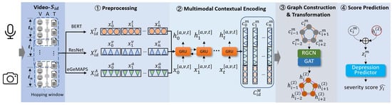 In our implementation, the recorded audio and video streams are temporally synchronized and segmented into utterances. Visual frames are aligned and processed using a pretrained ResNet-50 to extract facial features, while acoustic signals are analyzed using the eGeMAPS feature set via the OpenSmile toolkit. Transcripts are generated through automatic speech recognition (ASR), and semantic features are encoded using a pretrained RoBERTa model. These three modalities are fused and modeled through our graph-based architecture to capture both short- and long-term temporal patterns indicative of depressive symptoms.
