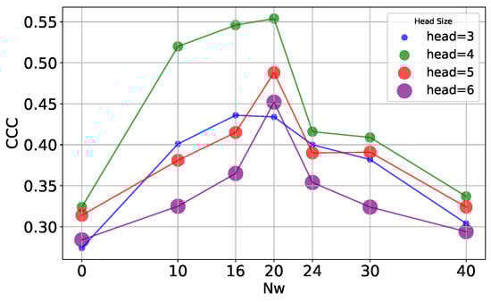 CCC results with the proposed method for different combinations on the AVEC2019 dataset, with different values on the horizontal axis and CCC values on the vertical axis, and different colors and bubble sizes in the graph for different numbers of heads.