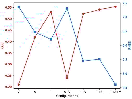 Plot of the experimental results of modal ablation on the AVEC2019 dataset when = 20, head = 4 with the proposed method, where the horizontal axis is the different modal ablation models, the red line represents the CCC index, and the blue curve represents the RMSE index.