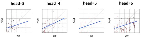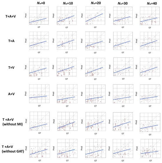 In order to compare the predictive performance of different models, we visualize the scatter of the true and predicted values. The scatterplot goes through the distribution of data points, which reflects the correlation between the predicted and true values (it depicts how the predicted values change with the true values when they change). Ideally, these points should be distributed along a straight line with y = x (the gray dotted line in each subplot), indicating that it has a perfect prediction. If the scatterplot shows points arranged roughly along a certain straight line, but not exactly y = x, this indicates that the predicted values have some linear correlation with the true values, but there is prediction error. To better illustrate the prediction trend, we reverse-fit the scatter points into a regression line, which is highlighted in blue in each subplot. In order to investigate the effect of the context window values and the number of attention heads for different ablation modes on the model, we visualized the scatter prediction results for the predicted results separately, and the results for the context window values and the attention heads are shown in Figure 5 and Figure 6, respectively, where each row is for a different ablation model, and each column is for a different context window value and a different number of attention heads, respectively. As can be seen from the figure, the regression line between the predicted and true values is closest to 45 degrees when using the three modalities of T + A + V, = 20, and heads = 4, which indicates that this model predicts more accurately. While the regression curves of other models are more shifted from y = x curve, and their predicted value distribution is also more discrete, at the same time part of the model for a real value has a large span of predicted values, such as T + V modalities and = 10, which proves that their prediction effects are not as good as that of the model proposed in this paper.